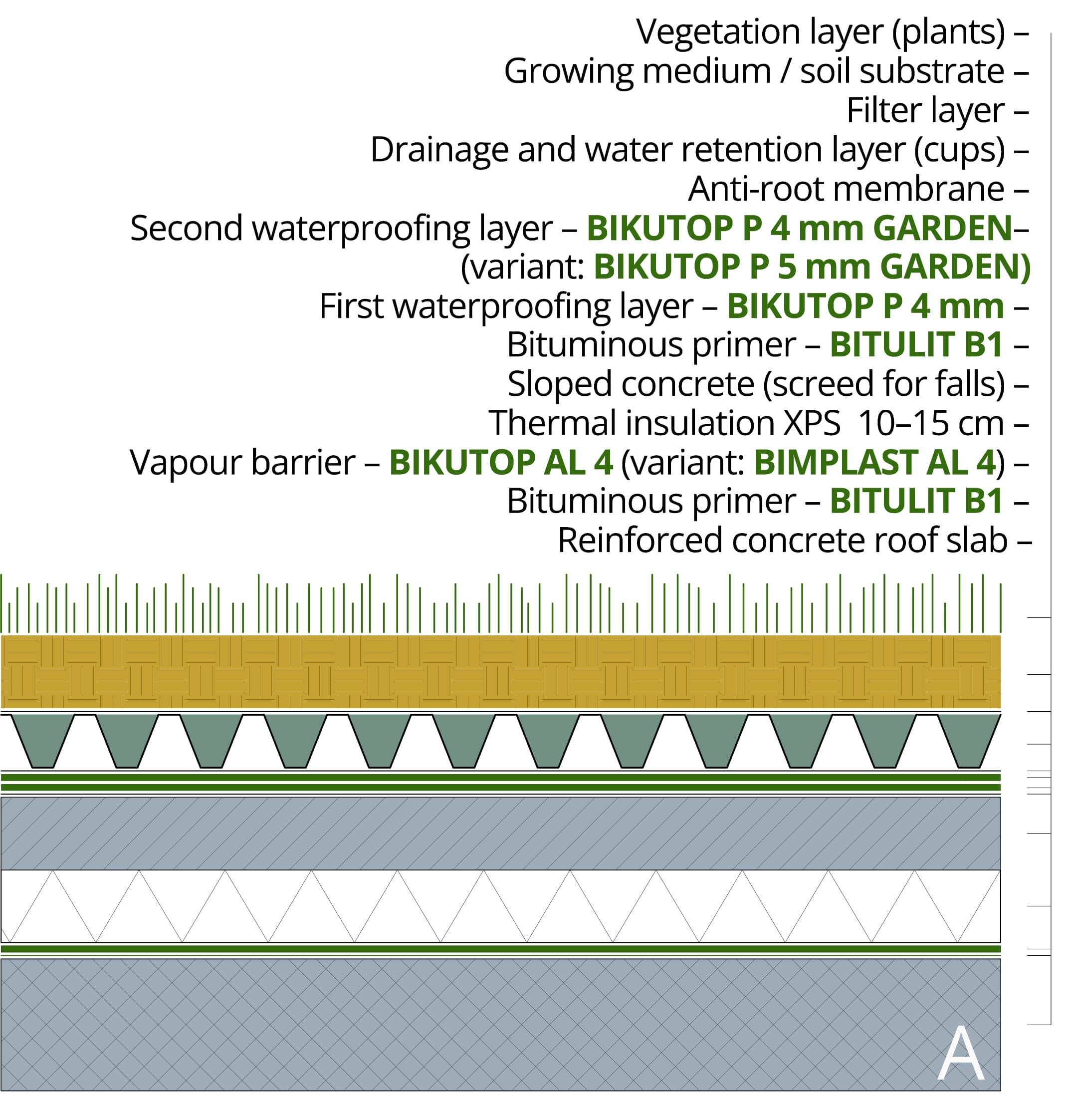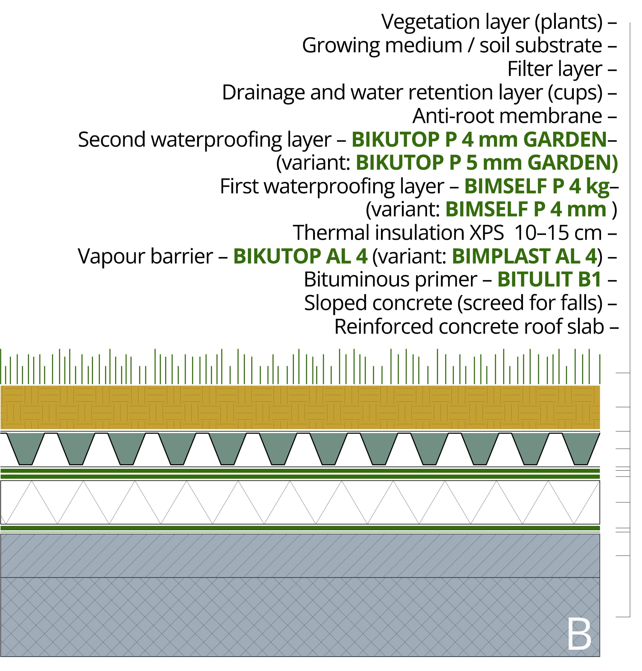 3 Vapour barrier – bituminous membrane with aluminized fiberglass  reinforcement, used as a vapour barrier (elastomeric BIKUTOP AL or plastomeric BIMPLAST AL); 4 Thermal insulation; 5 Sloped concrete screed with a minimum slope of 1.5%; 6 Bituminous primer BITULIT B1, applied to the sloped concrete screed substrate; 7 First waterproofing layer – high-quality (SBS) elastomeric bituminous membrane BIKUTOP P 4 mm, reinforced with polyester felt, torch-applied to the primed substrate; 8 Second waterproofing layer – high-quality (SBS) elastomeric bituminous membrane BIKUTOP P 4 mm GARDEN (variant: BIKUTOP P 5 mm GARDEN), root-resistant, reinforced with polyester felt, torch-applied over the first waterproofing layer; 9 Anti-root membrane; 10 Drainage and water retention layer (cups); 11 Filter layer; 12 Growing medium / soil substrate; 13 Vegetation layer (plants).
